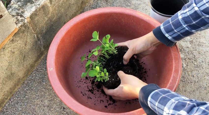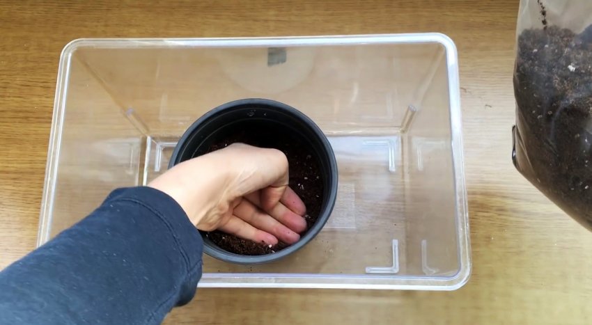Горшок для цветка поставьте в широкий контейнер. Важно, чтобы на дне горшочка были отверстия. Так, жидкость, которую не впитают семена, сможет легко проходить сквозь землю. Горшок заполните землей на половину и слегка утрамбуйте.