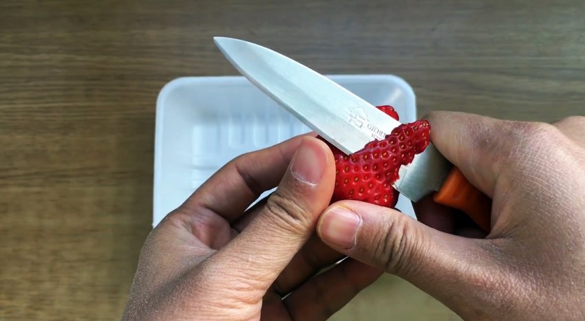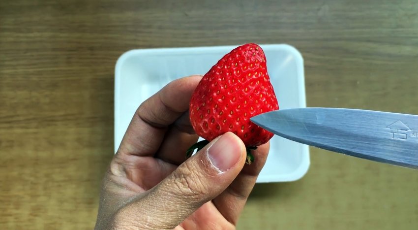 Острым ножом срежьте верхнюю часть клубники, как бы очищая ее.
