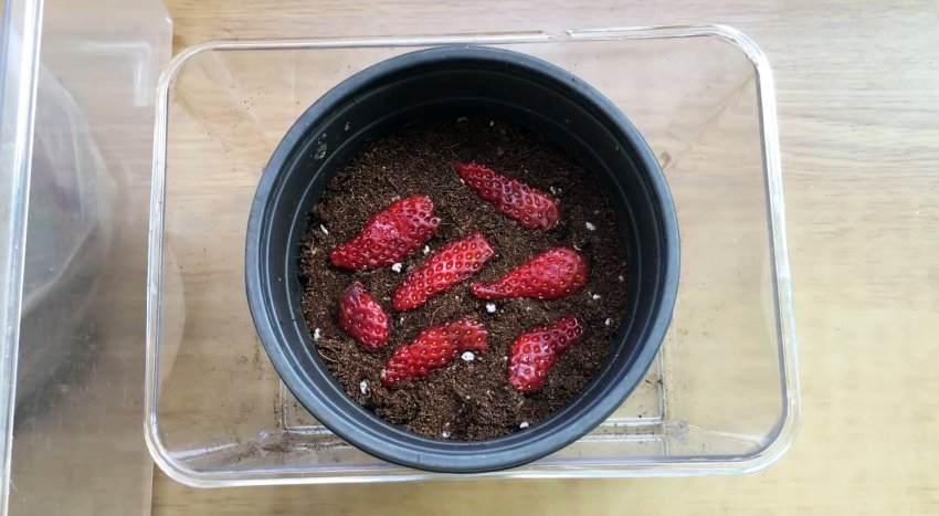 Выложите срезанные части ягоды на землю в горшке. Распределите их на небольшом расстоянии друг от друга.