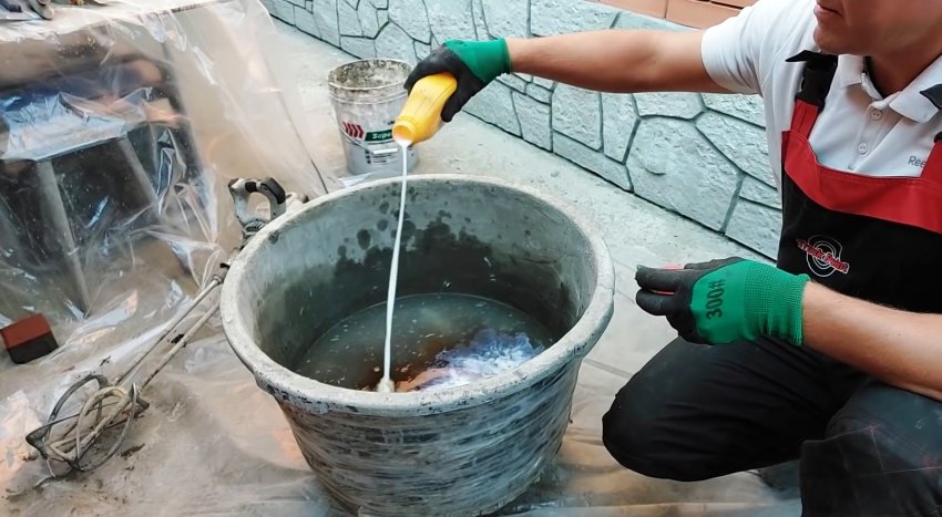 Затем заливаем 100 мл жидкого пластификатора, в данном случае Sika BV 3M, а также 100 мл Sika LATEX.