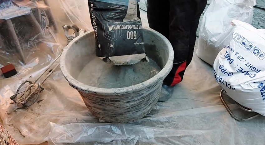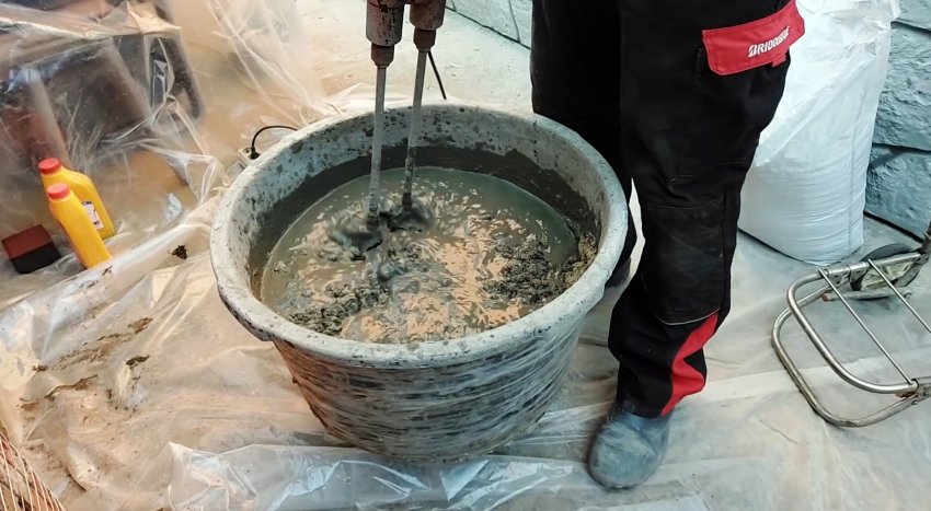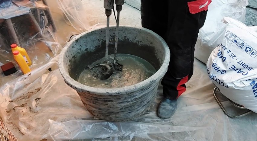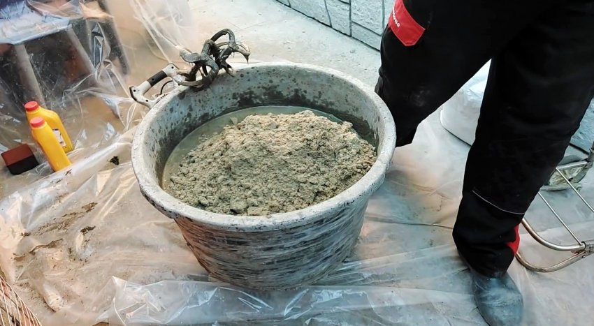 Через 10-15 мин фибра размокнет, и в таз засыпается мешок цемента.