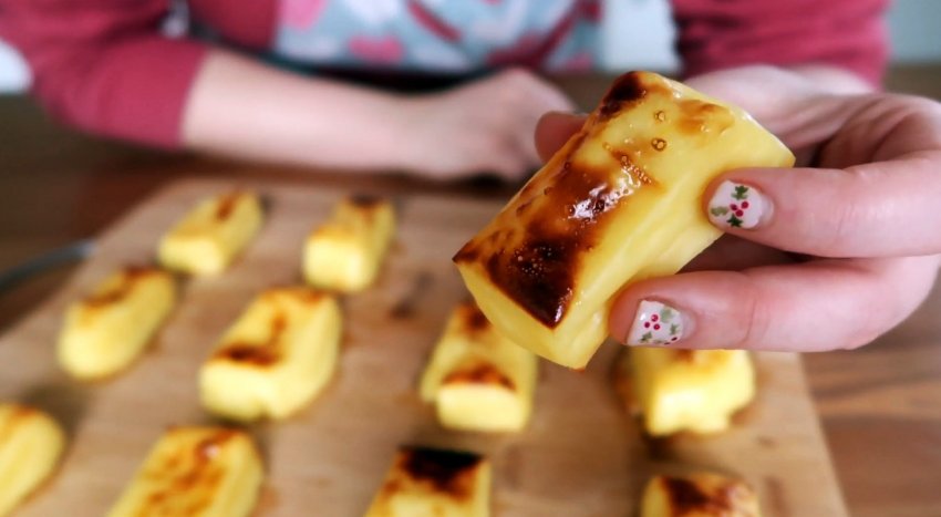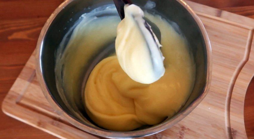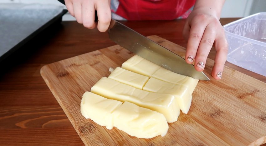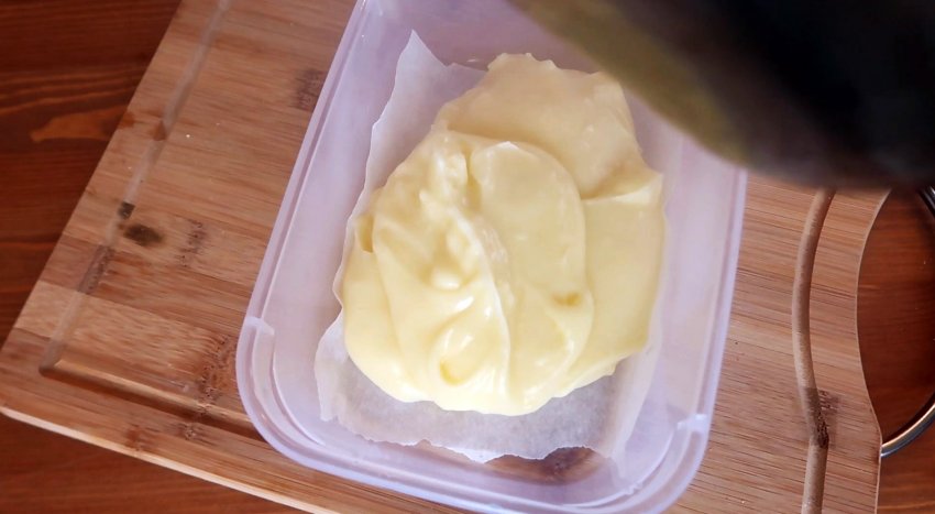 Крем выливается в форму с уложенным на дно листом пергамента. После остывания он переносится в холодильник на 1 час. Там он станет густым, и его можно будет извлечь, чтобы нарезать на порции.
