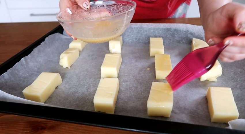 Кусочки выкладываются на противень с пергаментной бумагой. Сверху они смазываются взбитым яйцом с ванильным экстрактом. После этого десерт переносится в духовку, разогретую до 180°С.