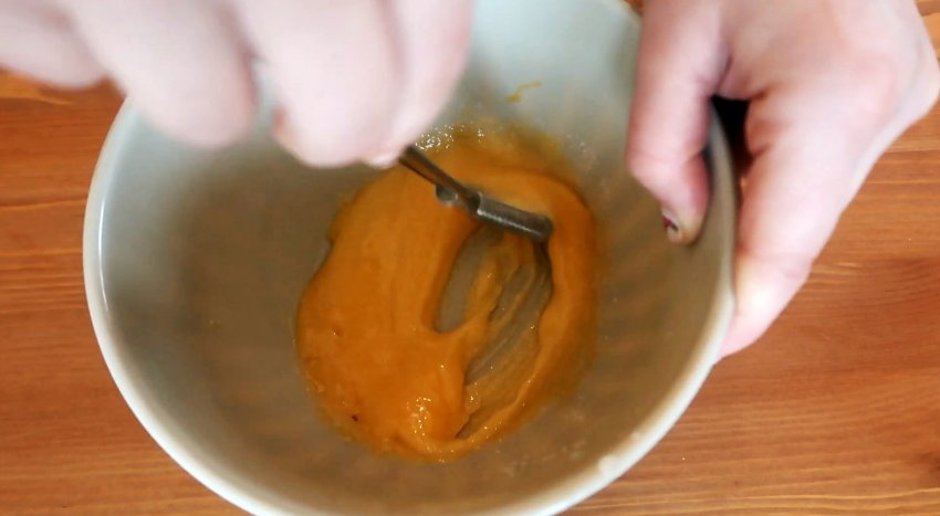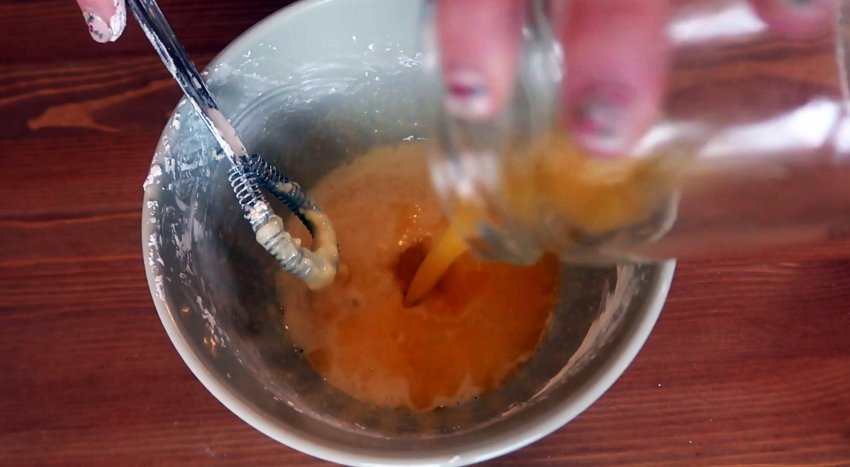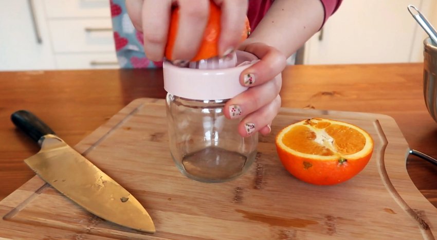 Затем к ним добавляется сок из одного апельсина. Это сделает вкус готового десерта более ярким.