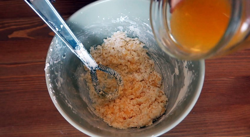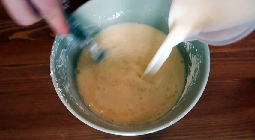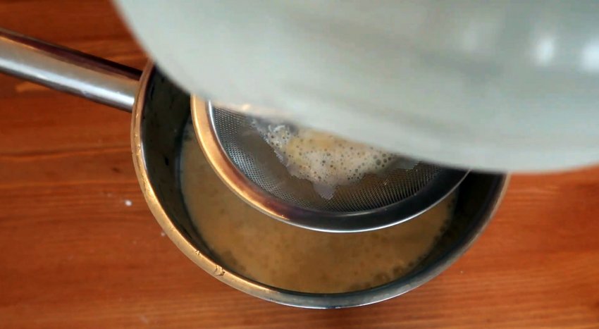 В смесь добавляется 0,5 л молока, после чего она еще раз перемешивается. После этого ее необходимо процедить в кастрюлю через мелкое сито, чтобы отфильтровать возможные комки.