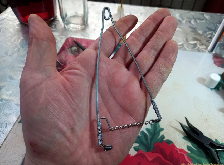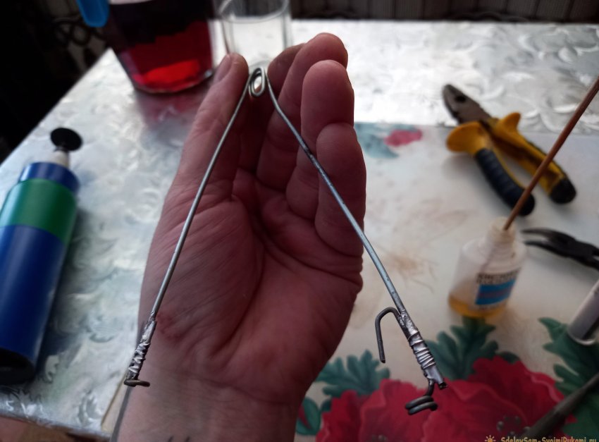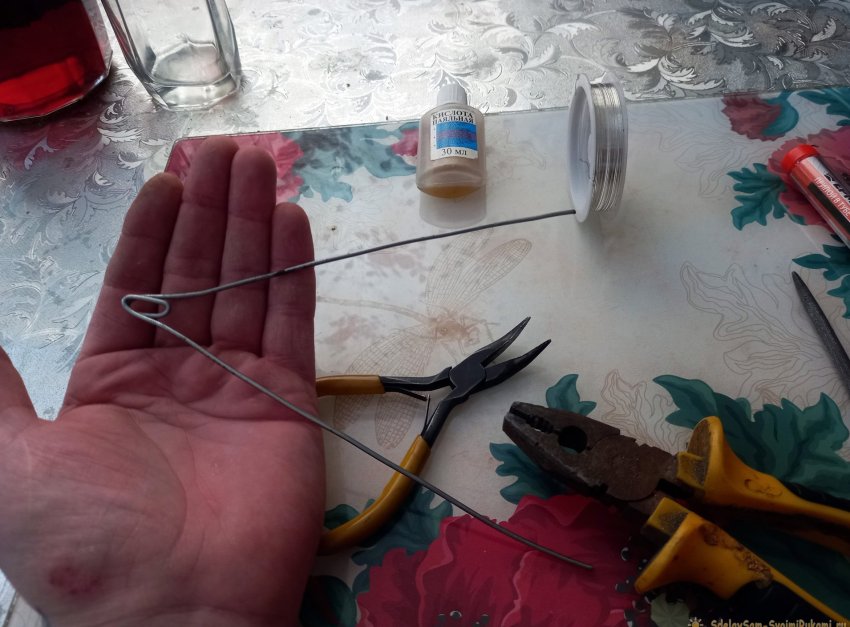 Определяем середину отрезка и, с помощью плоскогубцев, загибаем так, чтобы посередине отрезка получилось небольшое кольцо. Затем выпрямляем оставшиеся концы.