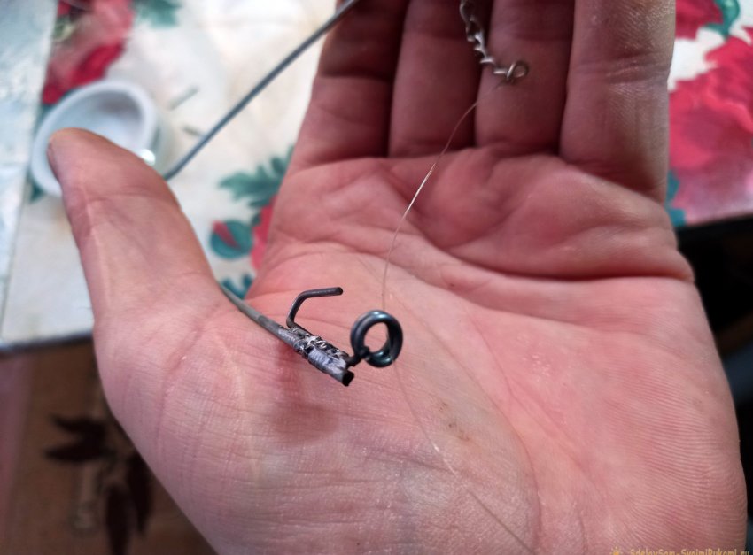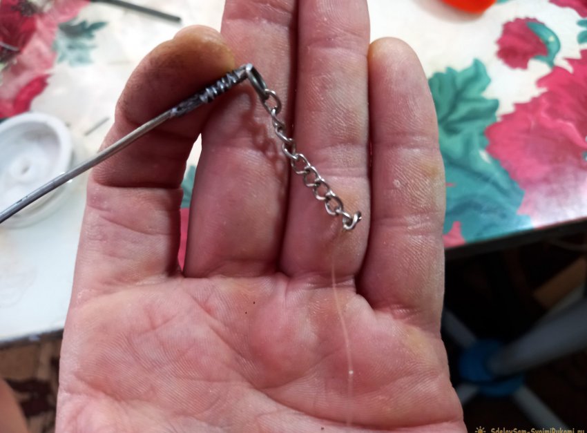 Осталось подвязать леску с крючком, или мормышкой. Леску следует продеть через кольцо, которое с крючком, и привязать её к свободному концу цепочки.