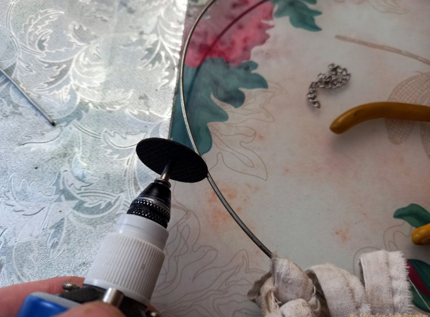 Для начала отрежем необходимый кусок стальной проволоки. Именно стальной, а не железной. То есть, проволока эта закалённая. Ей очень трудно задать нужную форму, но кода это удастся – лучшей пружины не придумать! Откусить такую проволоку плоскогубцами довольно проблематично, потому я вооружился дрелью с режущим диском. Кусок нам понадобится длиной 20 см. Отрезаем.