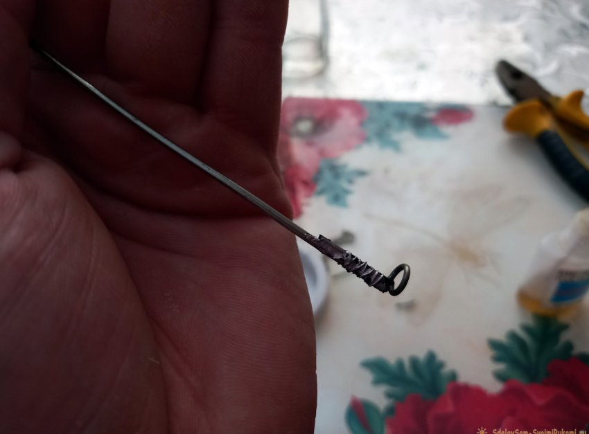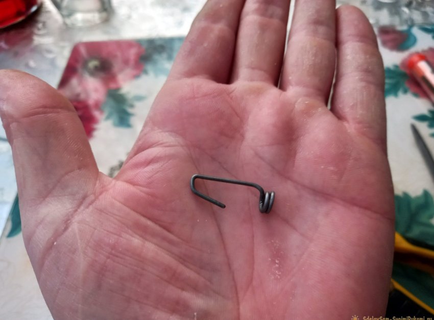 Задача не из лёгких, но вполне преодолимая. Далее, при помощи штырька от надфиля и тонких плоскогубцев, нужно изогнуть из тонкой железной проволоки (можно использовать выпрямленную скрепку) небольшое кольцо с крючком на конце. Вот такая, получается, загогулина:
