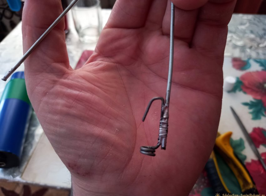 Теперь с помощью паяльника, олова, и флюса, лудим концы получившейся стальной пружины, и кольца с крючком. Тонкой вязальной проволочкой приматываем кольцо с крючком к одному из концов пружины, и запаиваем намертво, не жалея олова. Вот так: