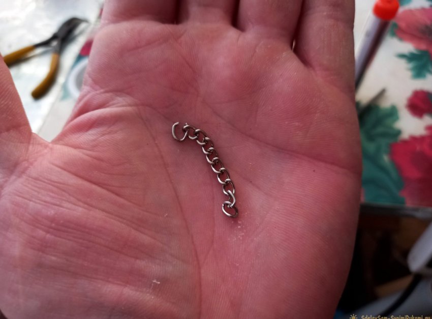 Далее, разводим концы пружины так, чтобы они зафиксировались на расстоянии примерно сантиметров 10-12 друг от друга. Теперь берём отрезок тонкой цепочки, 4см хватит, и цепляем его к кольцу, которое без крючка.