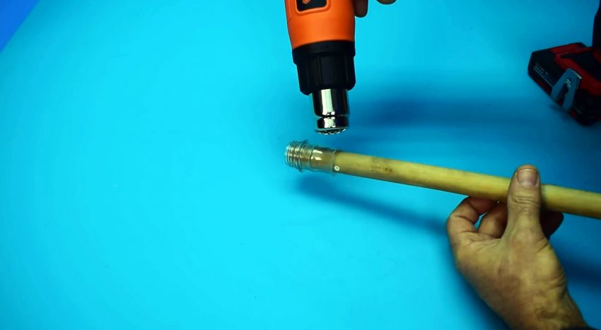 В результате термоусадки пластик обожмет ручку. Останется немного укрепить эту втулку гвоздиками или саморезами.