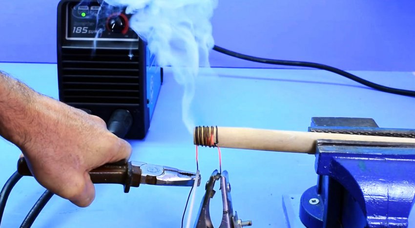 На ее края подключаются провода от сварочного инвертора. Ставим на нем минимальный ток, и включаем.