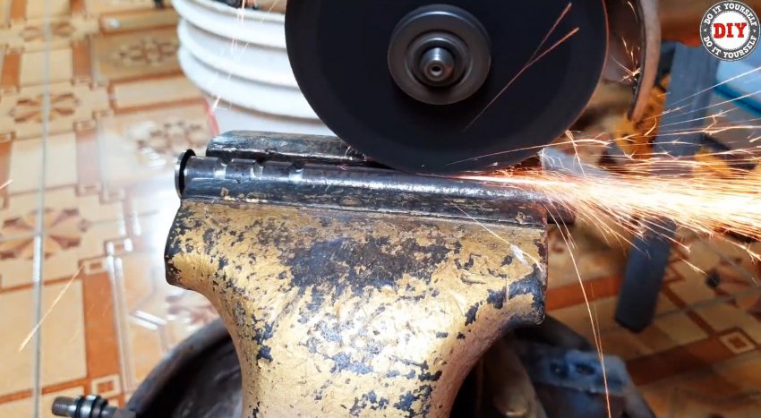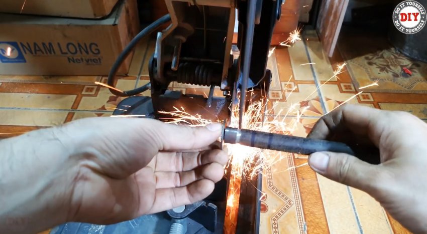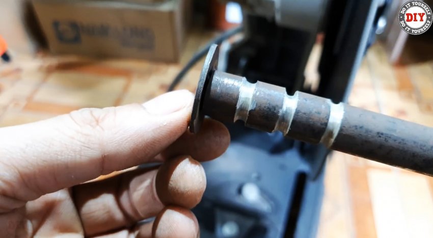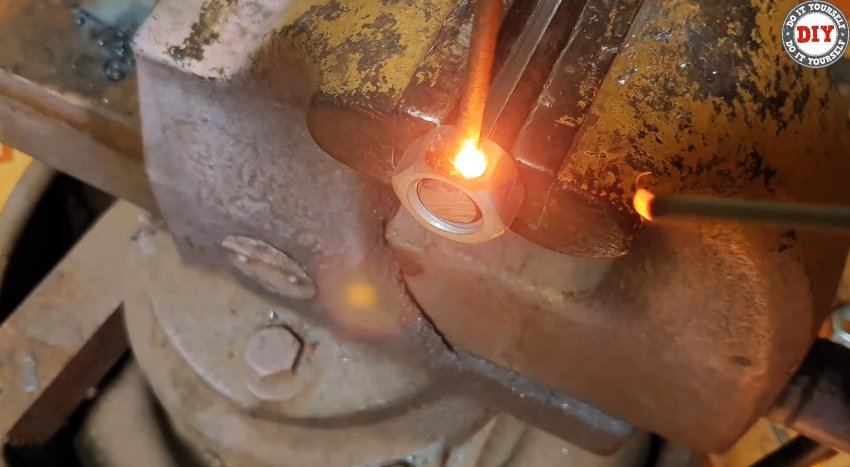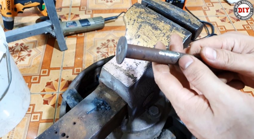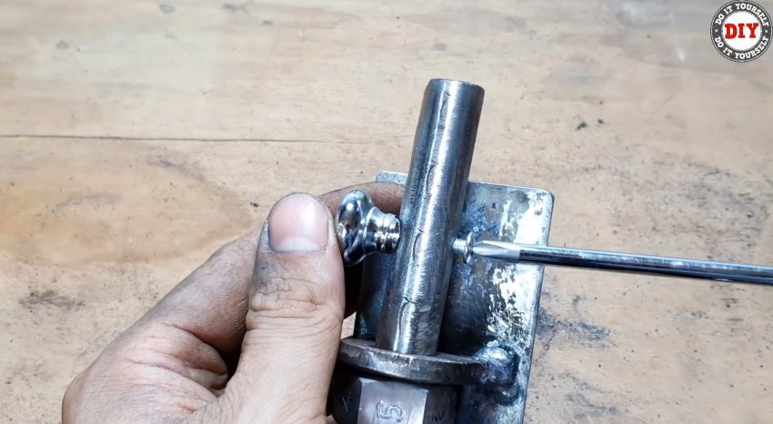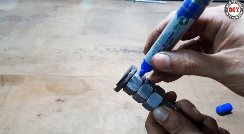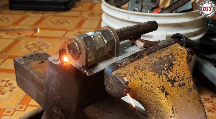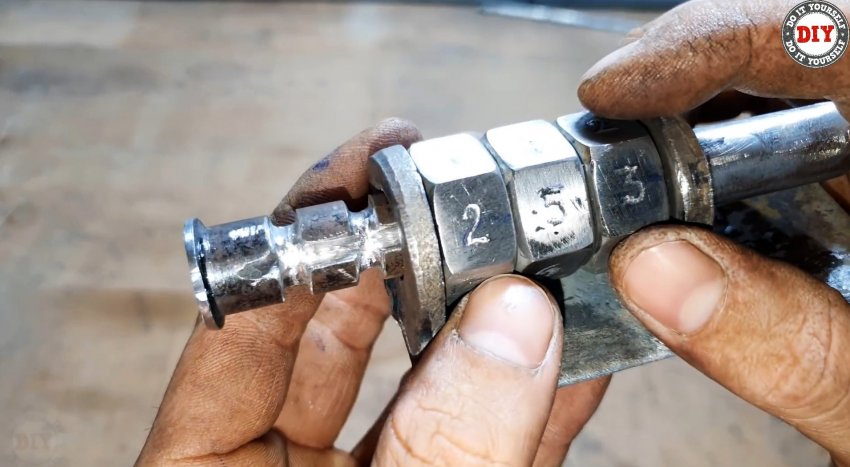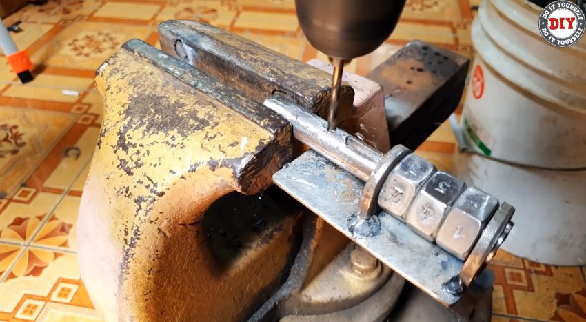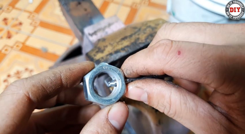 Срезаем шляпку железного гвоздя, рассверливаем в гайках отверстия до его диаметра. Вставляем, предварительно заостренный конец гвоздя по форме проточек и паза на стержне, в отверстие и привариваем его там. Отрезаем гвоздь заподлицо с наружной поверхностью грани гайки.