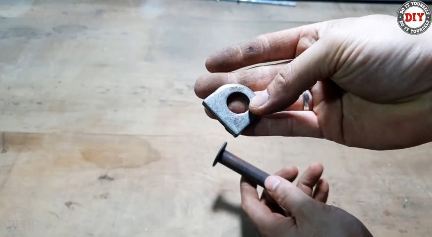 На стержень последовательно нанизываем проушину, три гайки и вторую проушину. Устанавливаем полученный узел ножками проушин на прямоугольную пластину и привариваем первую проушину. Затем поджимаем вторую проушину так, чтобы гайки свободно поворачивались друг относительно друга, и привариваем к пластине вторую проушину.