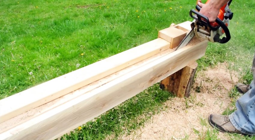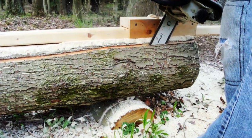 Чтобы воспользоваться устройством, нужно прикрутить направляющую балку саморезами на уложенное горизонтально на небольшом возвышении бревно. Если оно имеет расширение в начале, то его следует спилить. Балка должна ложиться устойчиво без прогибов.