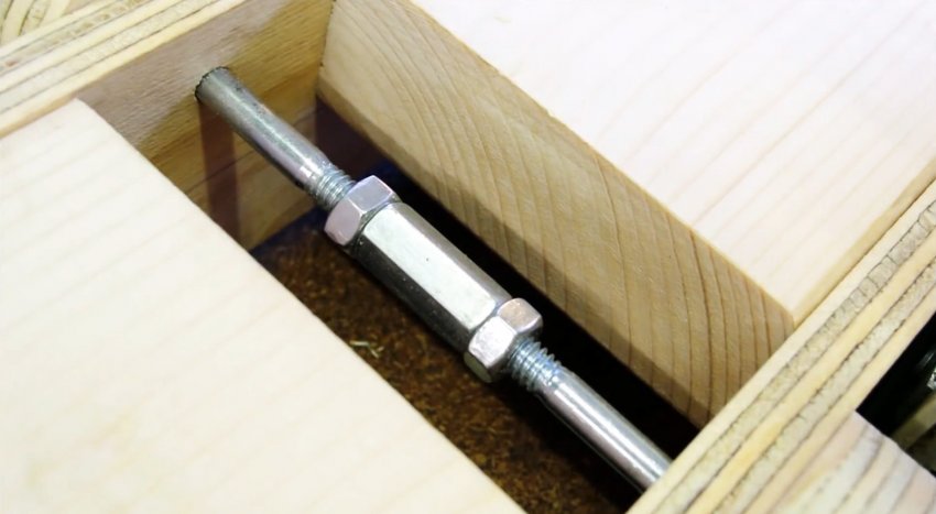 По центру боковины кондуктора просверливаются. Отверстия должны располагаться так, чтобы не выступать ниже верхних досок. В отверстия вставляются с двух сторон длинные болты, которые нужно соединить удлиненной гайкой. Чтобы они не раскручивались, потребуется их законтрогаить. На болты, перед установкой в кондуктор, нужно будет поставить шайбы из фанеры, изготовленные с помощью корончатого сверла.
