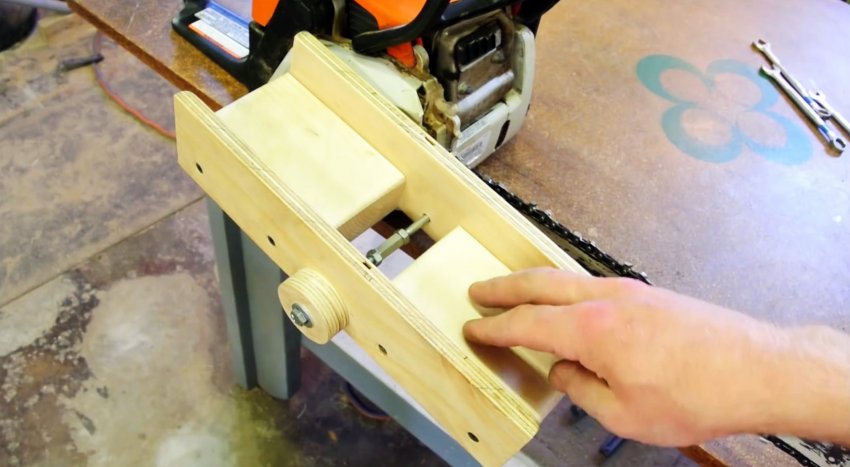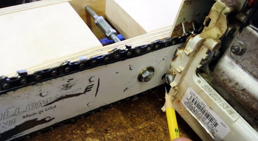 Кондуктор с помощью полученной из болтов стяжки необходимо прикрутить к шине цепной пилы. Для этого последняя просверливается.