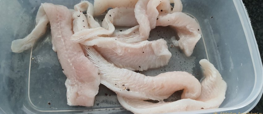 Шаг 2. Кусочки рыбы положить в миску и хорошо посолить. Сок лимона, перец и другие специи добавить по желанию. Чтобы филе без панировки не развалилось на сковородке и не прилипло, соль должна впитаться в рыбу. Поэтому филе должно постоять. Минут 15-20 будет достаточно.