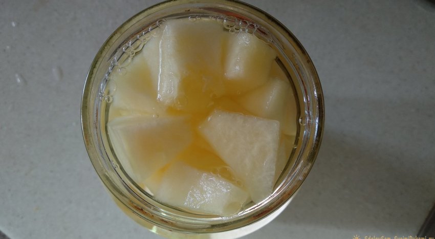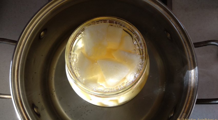 Дыня заливается сиропом. Банка с дыней помещается кипящую воду для стерилизации.