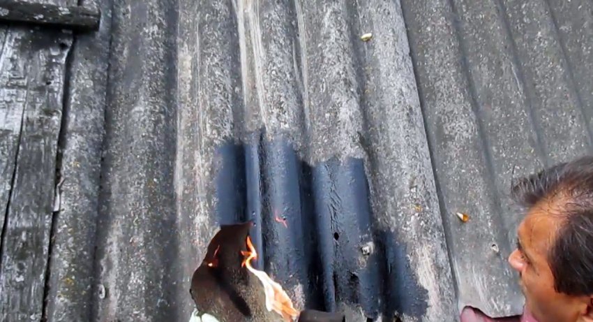 После этого, не мешкая, укладываем их на очищенную шиферную поверхность, покрытую битумной мастикой, и прижимаем руками в рукавицах от повышенных температур. Там, где куски рубероида приклеились не полностью, прогреваем тем же пламенем паяльной лампы. Желательно, чтобы битум выступил по всей поверхности кусков рубероида, но необязательно.
