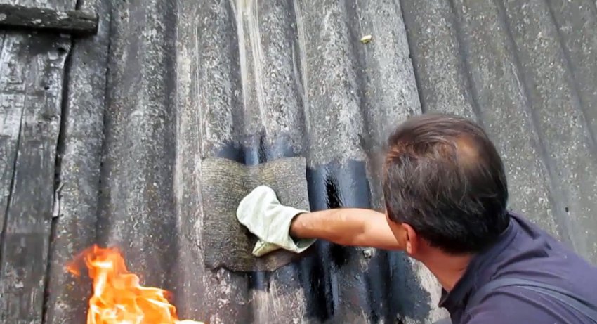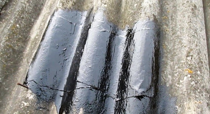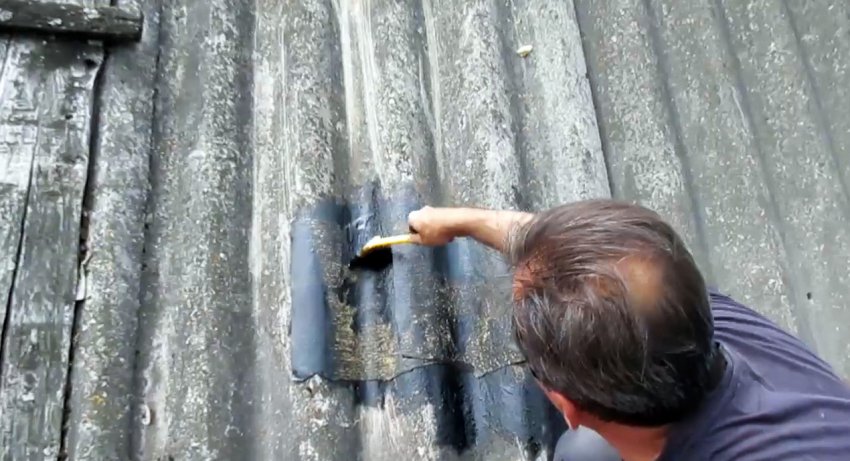С помощью любой кисти обильно наносим на очищенную шиферную поверхность битумную мастику.