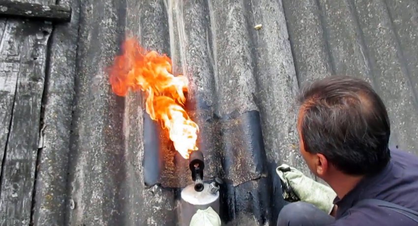 Разжигаем паяльную лампу и в режиме мягкого пламени желтоватого оттенка направляем его на поверхность кусков рубероида до тех пор, пока они не обмякнут и на них не начнет расплавляться битум.