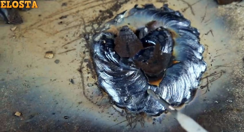 Если не получается выгнать его из сварочной ванны непосредственно при сварке, можно, как было показано раньше, отбить шлак и закрыть отверстие последним швом.