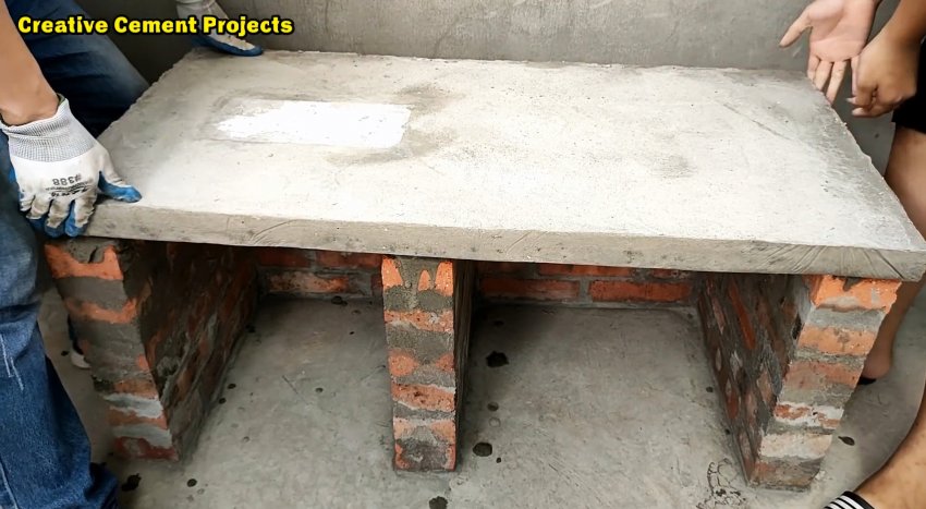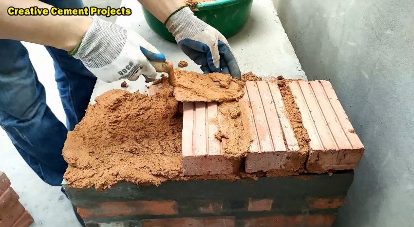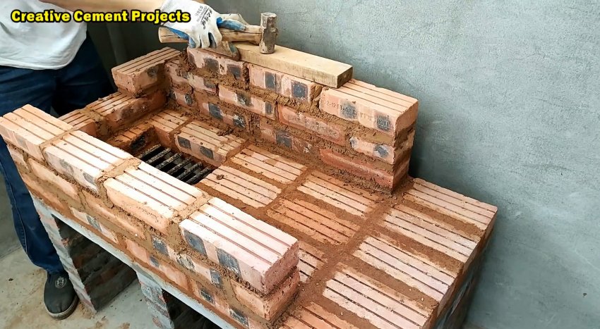 Замешиваем огнеупорный раствор из глины, цемента, песка и воды, и укладываем на цементную плиту по всей ее поверхности кирпичи, уплотняя и заглаживая швы. Для лучшей осадки кирпичи простукиваем молотком через деревянный брус.