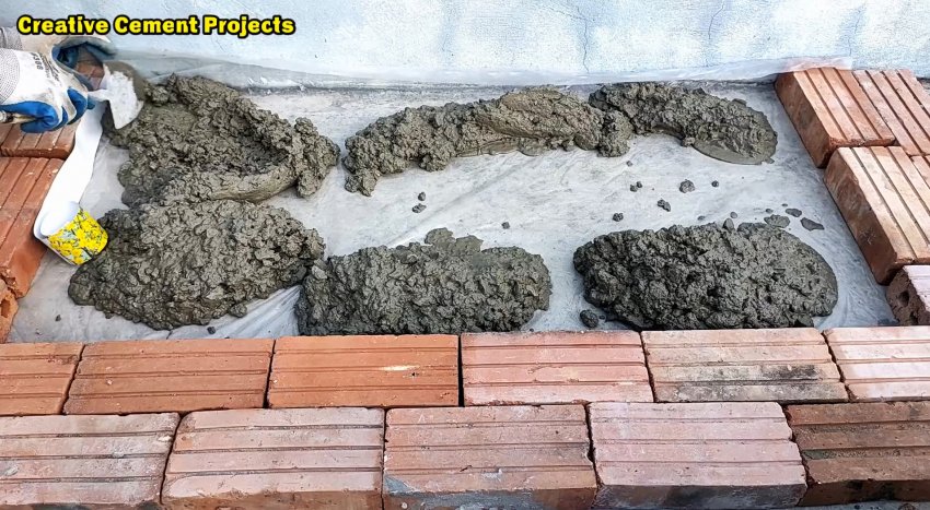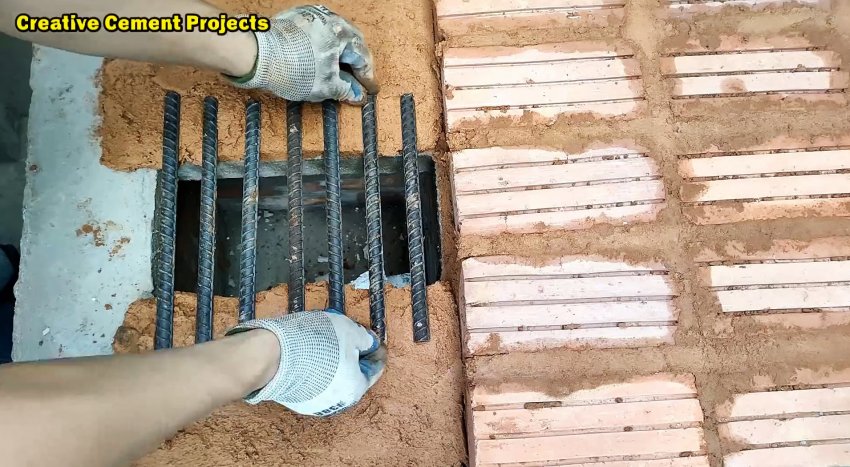 Укладываем на раствор вязаную арматуру, слегка утапливаем ее в раствор и добавляем смесь до верхнего уровня кирпичей. Даем время для схватывания и затвердевания армированного раствора. Разбираем кирпичи и удаляем ленту.