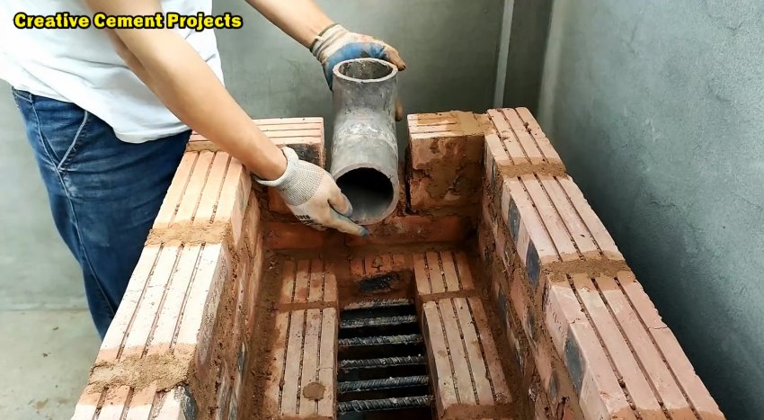 В проем задней стенки топки устанавливаем асбестоцементное колено, ориентируя его наружную короткую часть строго вертикально. Колено снаружи заполняем и обмазываем огнеупорной массой.