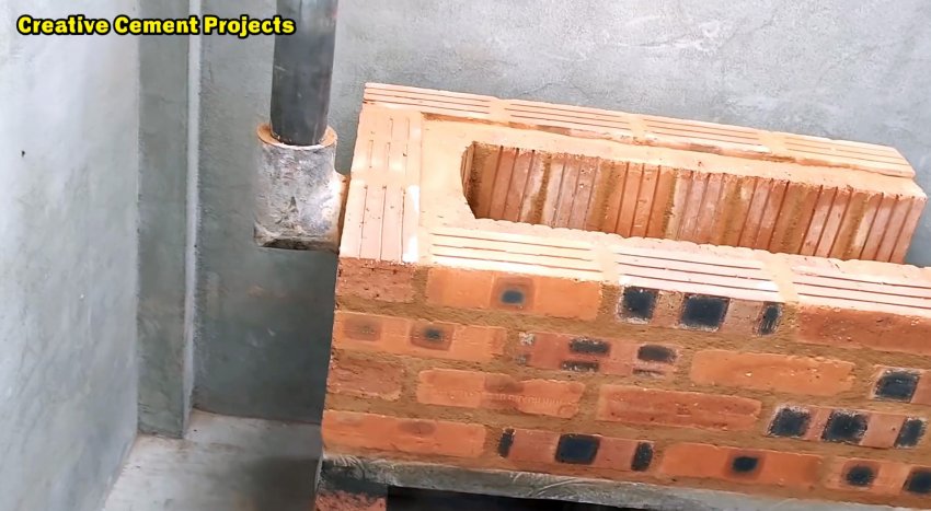 Выбиваем из цементно-песчаной плиты пенопласт и продолжаем кладку кирпичей, не закладывая «окошко» в плите.
