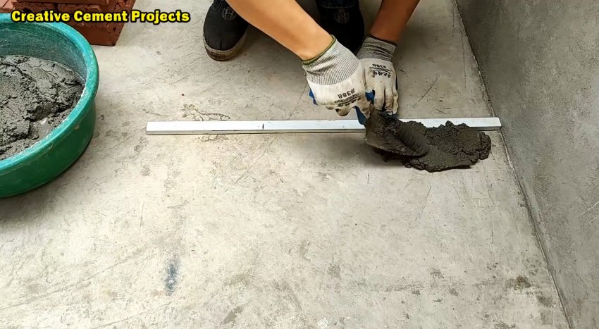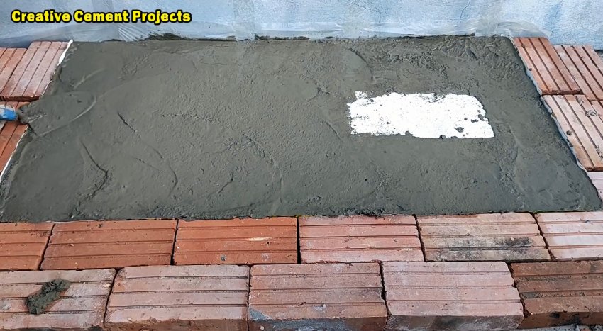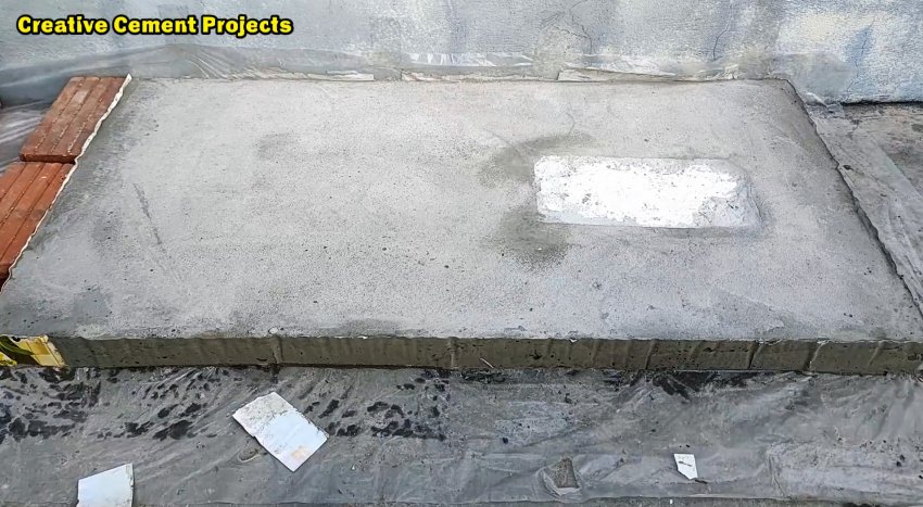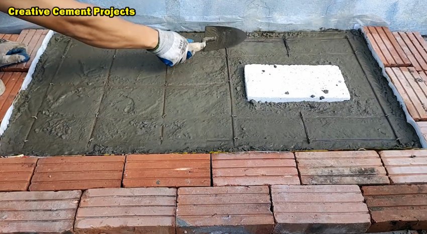 По осевой линии площадки, ближе к одному краю на пленку кладем «кирпич» из пенопласта, уплотняем и разравниваем раствор по всей площадке.