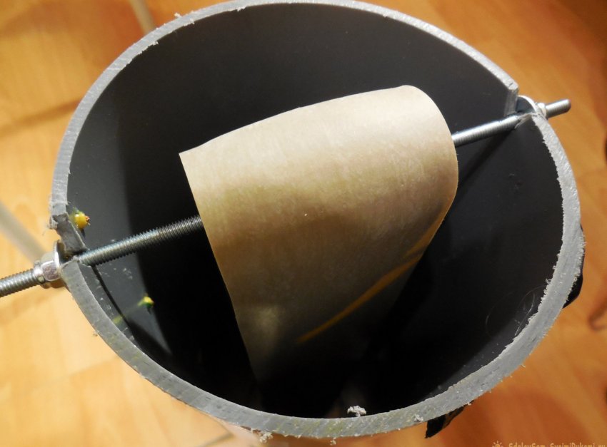 При использовании канализационной трубы диаметром 11 см оптимальная высота конструкции будет составлять около 1 метра. Вся конструкция будет устанавливаться на подставку из обрезка доски.