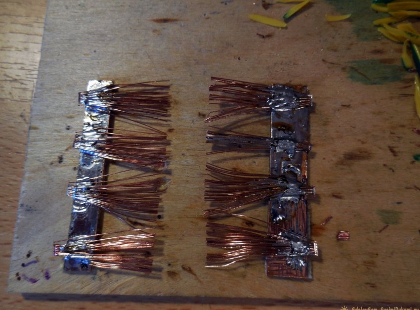 Следующая часть генератора – щётки, через которые заряд будет «наносится» на ленту и «стекать» с неё в верхнюю металлическую сферу. Щётки рекомендую сделать из отрезка многожильного кабеля, который оголяется от изоляции, распушается и припаивается на текстолитовые пластинки. Изготовить следует две такие щётки, на нижний ролик и на верхний. Нижняя щётка будет соединяться с нижним роликом и подключаться к заземлению, а верхняя будет подключена к металлической сфере. На фото ниже представлены готовые щётки.