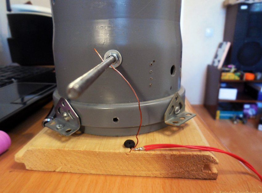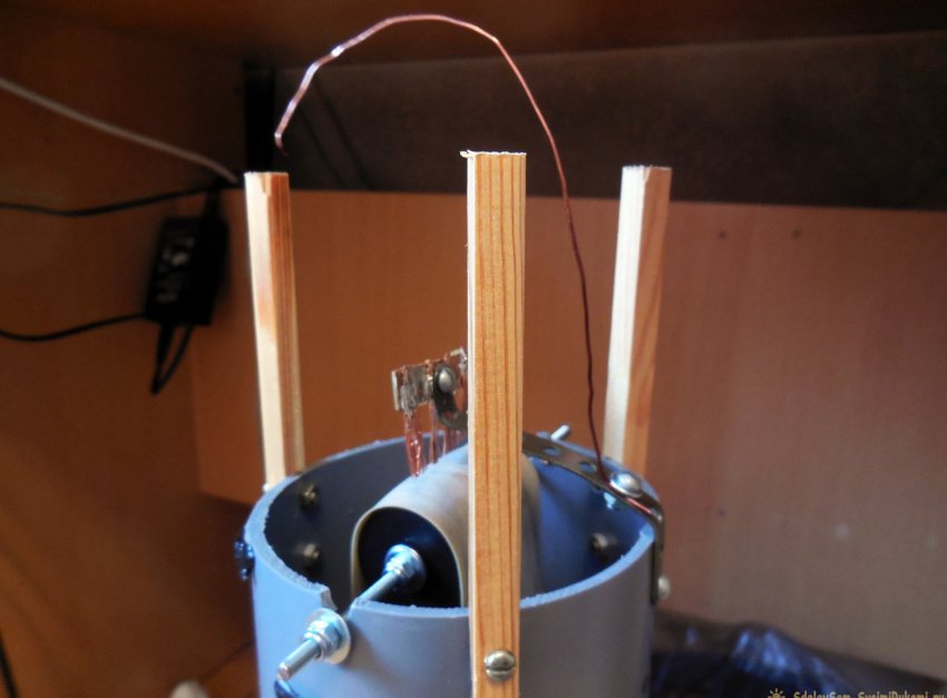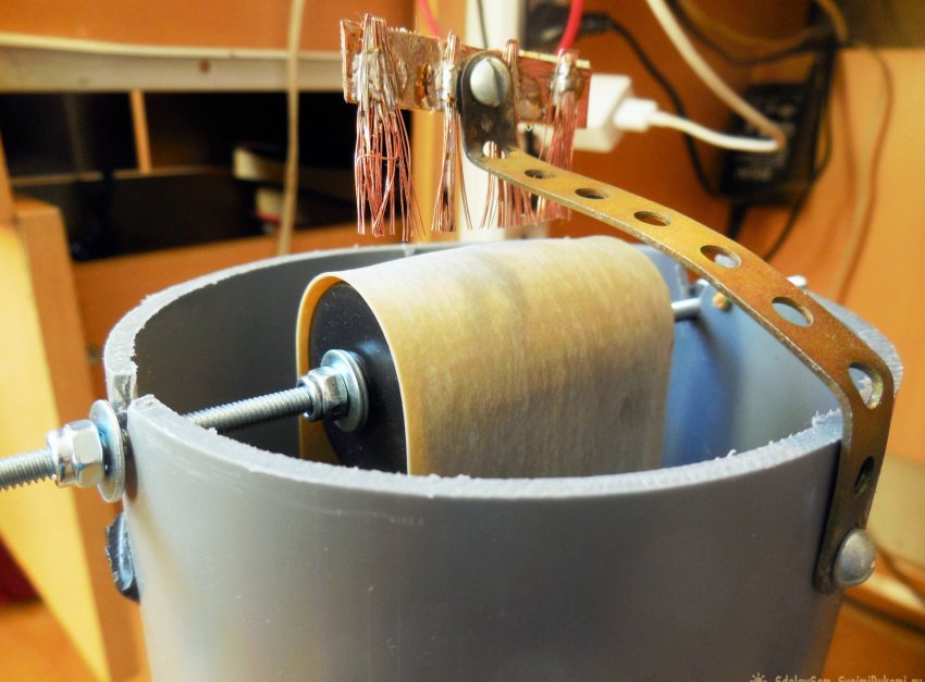В нижней части конструкции с помощью такого же кусочка проволоки обеспечивается контакт вала, ролика и щёлки с заземлением. Обратите внимание, что для работы генератора обязательно наличие хорошего заземления.