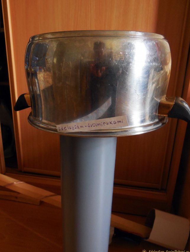 Теперь осталось сделать опоры, на которые встанет верхняя сфера – в моём случае ей нашёлся более доступный аналог в виде перевёрнутой кастрюли. Торчащий выше уровня опор отрезок проволоки соединён со щёткой, он будет обеспечивать её контакт со сферой.