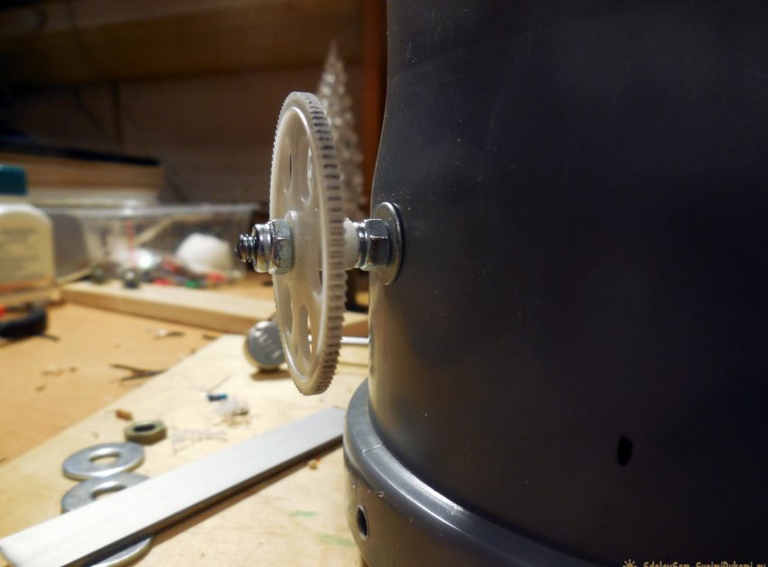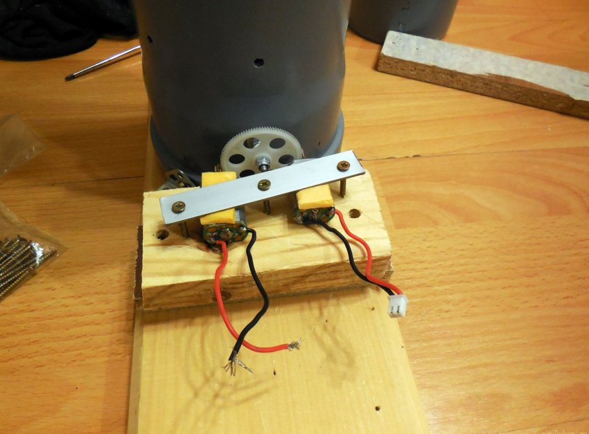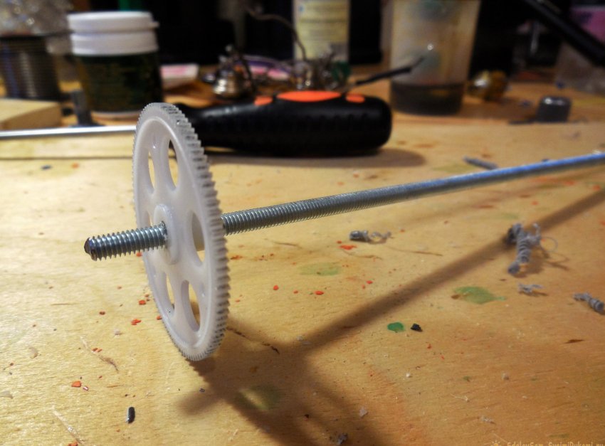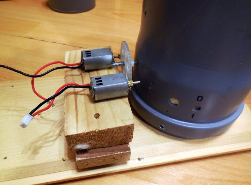 В качестве двигателя для вращения ленты я использую приводной узел от радиоуправляемого вертолёта, который представляет собой пару двигателей, которые совместно вращают большую шестерню, при этом образуется редуктор, понижающий обороты до нужного уровня и повышающий крутящий момент. Ведомая шестерня крепится на шпильку М4, которая проходит сквозь всю трубу в нижней части, в дальнейшем на ней будет крепится вал с роликом. Как показала практика, достаточно одного вертолётного мотора – несмотря на большие размеры, такие моторы имеют приличную мощность и легко крутят всю ленту внутри корпуса.