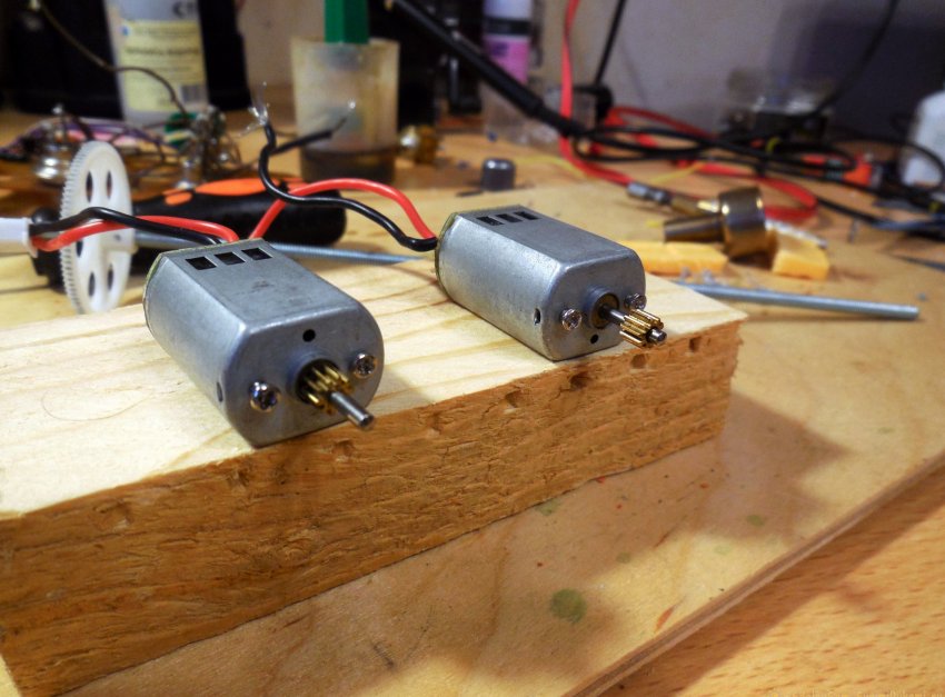 Сверху моторы прижимаются металлической полосой, предварительно установлена соосность всех шестерёнок. Предпочтительнее использовать для питания двигателя в генераторе Ван де Граафа аккумуляторные источники питания, никак не связанные с сетью, даже через трансформаторную гальваническую развязку.