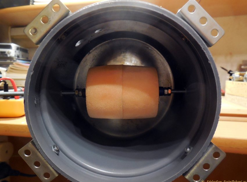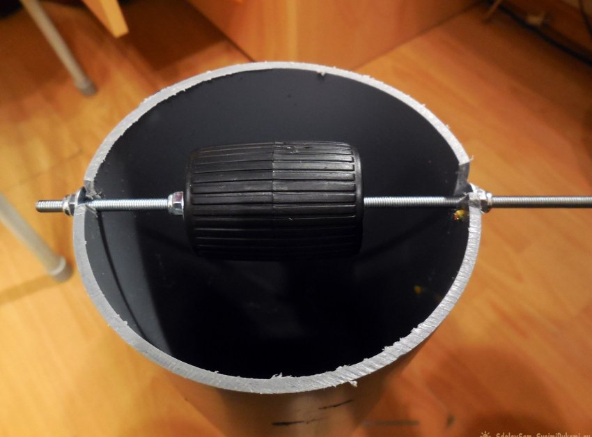 Верхний ролик я взял готовый от малярного валика, он идеально подходит по форме и размерам. Ролик аналогично нижнему устанавливается на шпильку м4, которая в пазы устанавливается на верхнюю часть трубы, что можно увидеть на фото ниже.