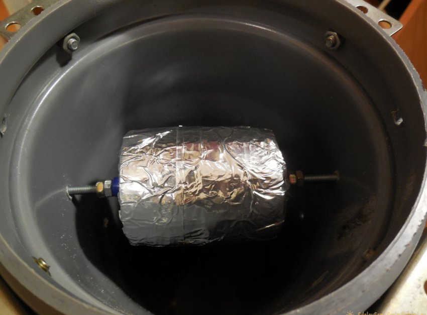На картинках выше показан нижний ролик. Его удалось выточить из двух кусочков утеплителя пеноплекса, придав бочкообразную форму. Обратите внимание, что форма должна быть именно бочкообразной, с небольшим плавным утолщением посередине – если вал будет полностью ровным, лента будет то и дело соскакивать. Немалую роль в постройке генератора играет материал валиков – нижний должен быть металлическим, а верхний – пластиковым. При этом делать нижний вал цельнометаллическим не обязательно, достаточно покрыть его сверху проводящей фольгой, эта фольга также должна электрически соединяться с валом, на котором сидит ролик.