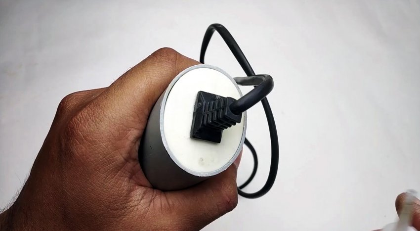 Торец трубы закрывается пластиковой или деревянной заглушкой, в которую продевается кабель с вилкой. Провода надёжно скручиваются или спаиваются и изолируются.