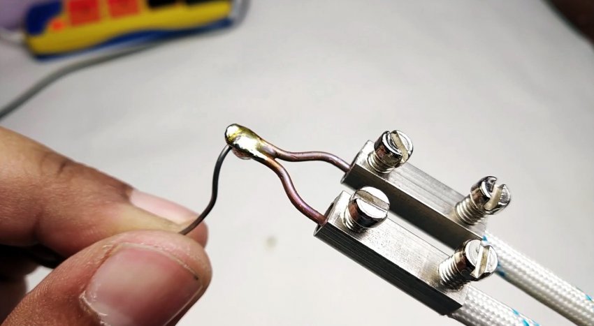 Из куска меди сгибается жало паяльника и соединяется с выходящими проводами посредством коннекторов.