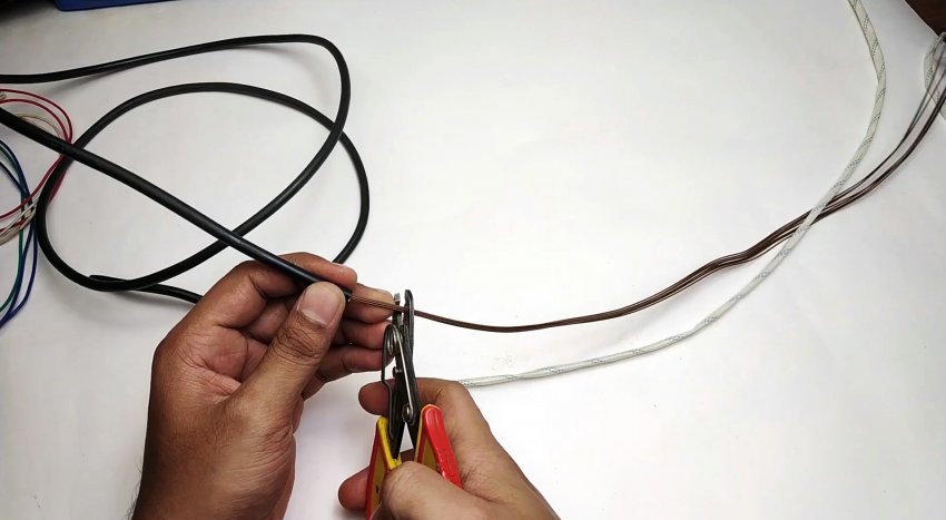 Выходящие из рукава провода укорачиваются до примерно 15 мм. К ним крепятся коннекторы.