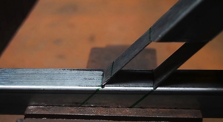 Для этого соединения обе трубки подготавливаются одинаково. На них нужно сделать разметку на пересечении. Она представляет собой 2 поперечные линии, расстояние между которыми равно ширине труб. Затем делается аналогичная разметка с боков, но только на половину стенок.
