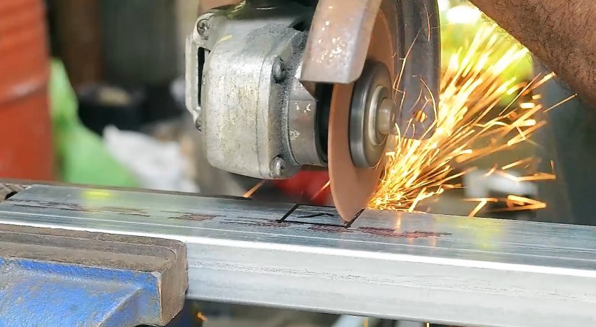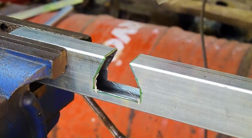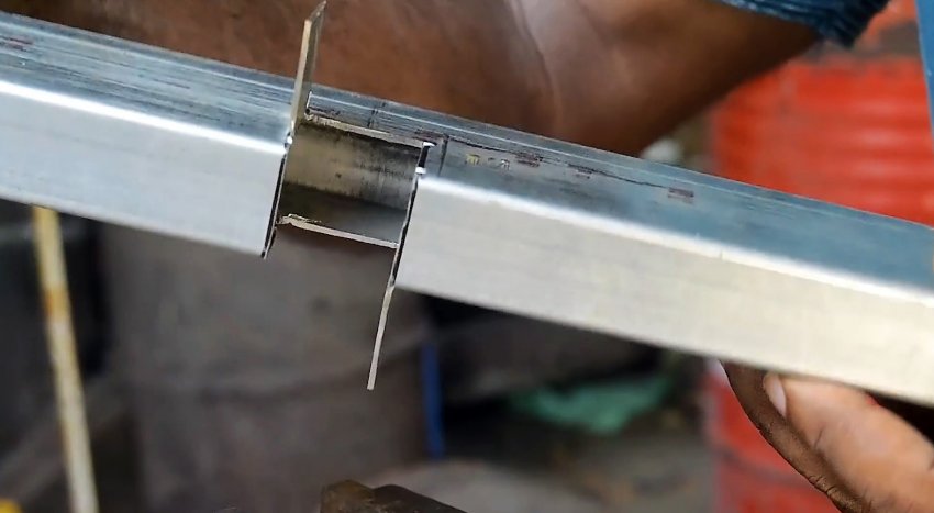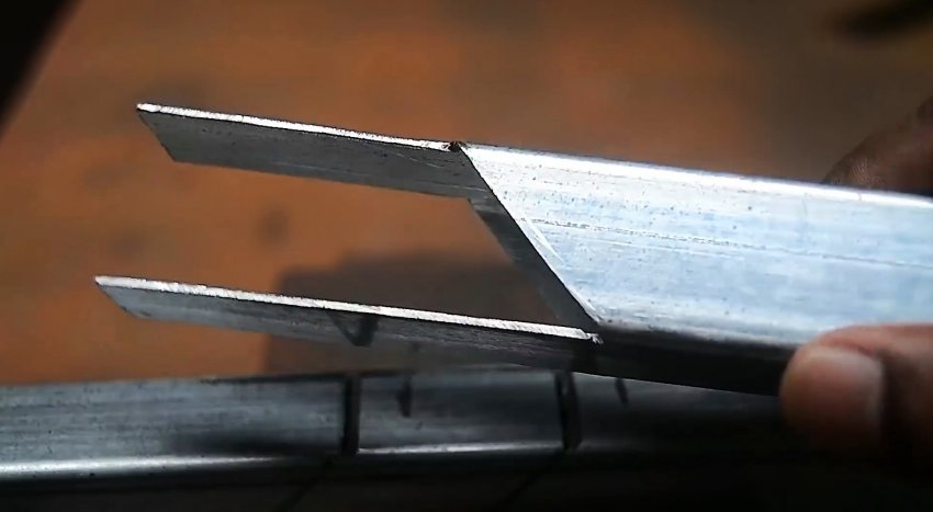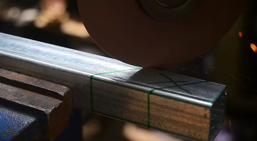 Такая же разметка делается на второй трубе с небольшим отступом от края. Затем нужно прорезать болгаркой грани трубы от края до первой косой линии. В итоге должны остаться усики с боков, стенки же с прямыми линиями удаляются.