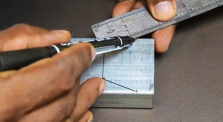 На одной трубе необходимо начертить 2 параллельные линии под 45 градусов, расстояние между которыми равно ширине трубы. Аналогичный чертеж делается на обратной стенке. Затем на оставшихся неразмеченных сторонах они соединяются между собой поперечными линиями.