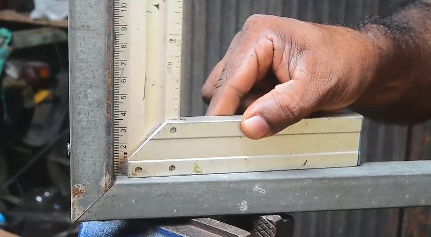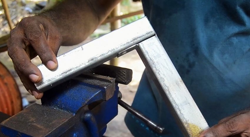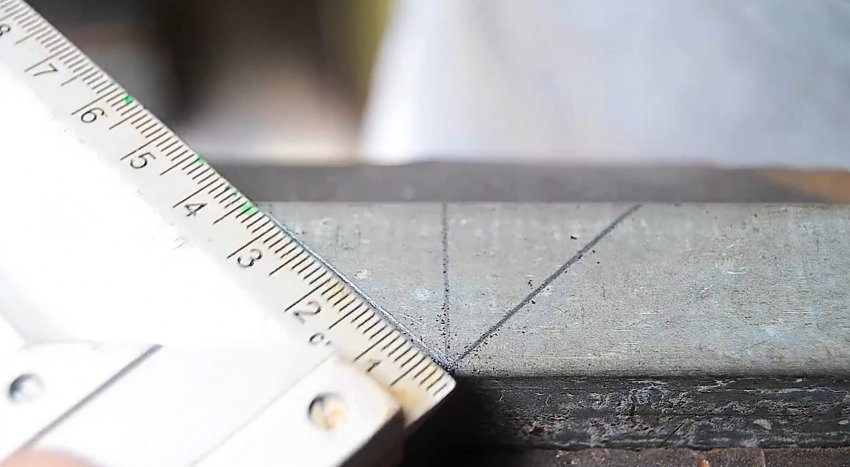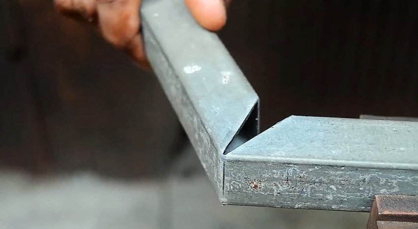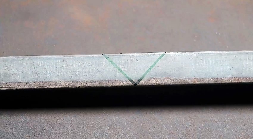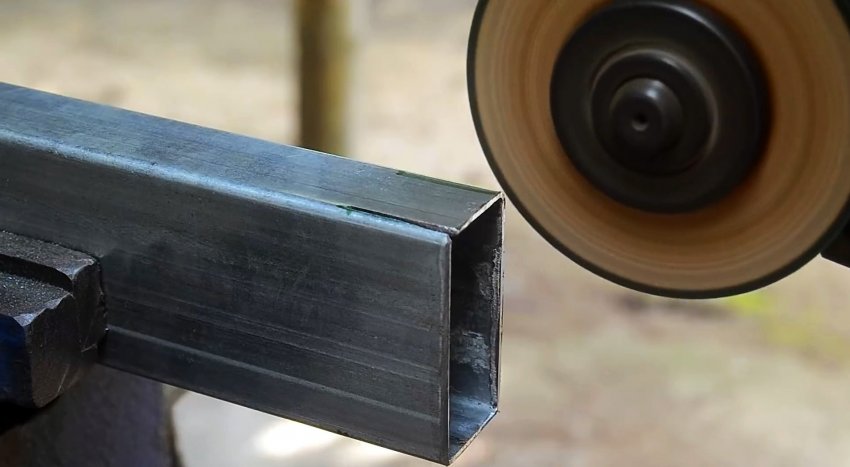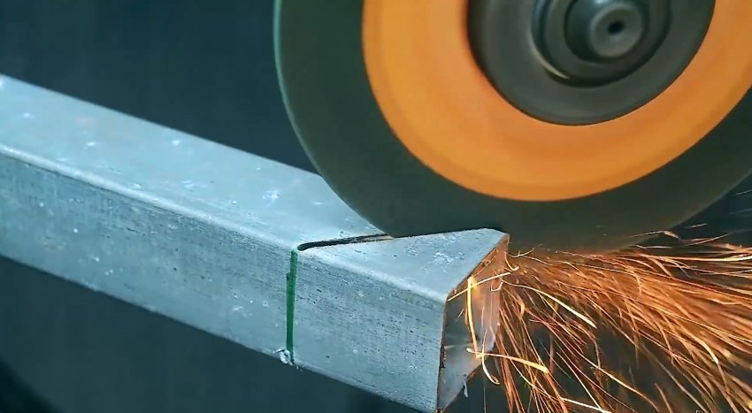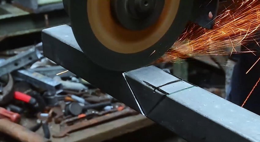 На одной трубе необходимо начертить с одной точки 2 косые линии под 45 градусов. Аналогично делается на противоположной стенке. Затем линии соединяются на лицевой стороне. Теперь нужно вырезать болгаркой размеченные части, и согнуть трубу.