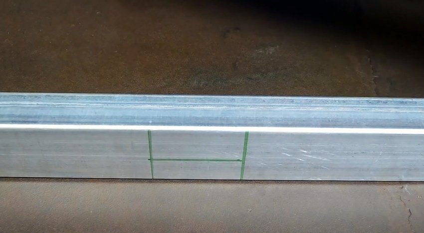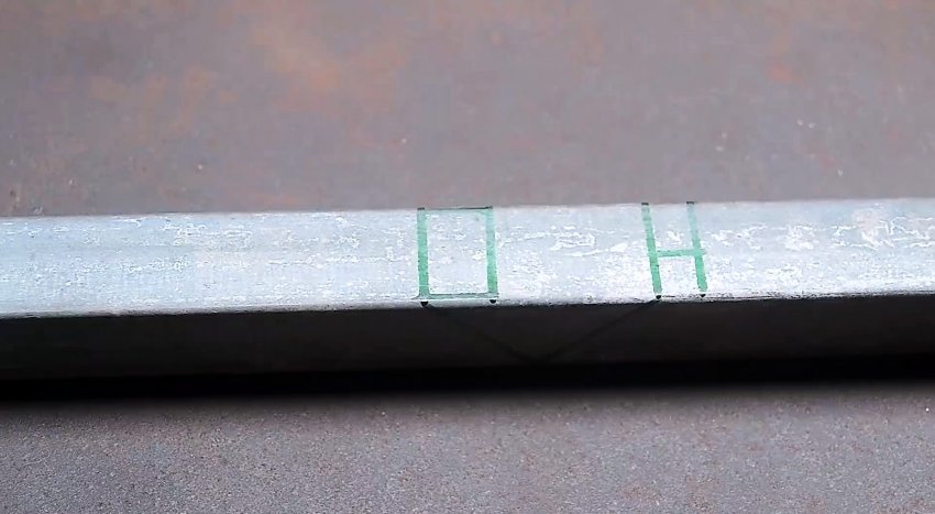 Эта разметка переносится на боковые стороны трубы. Затем необходимо с помощью болгарки совершая разрезы по меткам и граням трубы, вырезать боковые размеченные стенки. На лицевой стороне оставляется без надреза только одна поперечная линия.