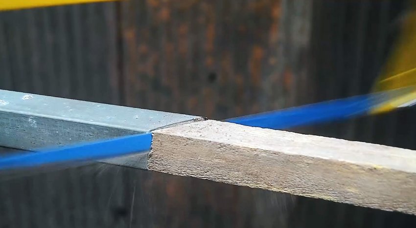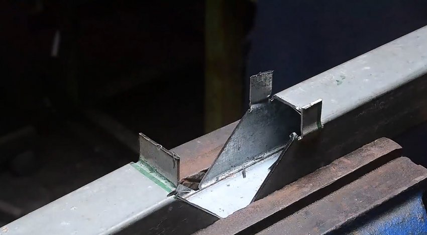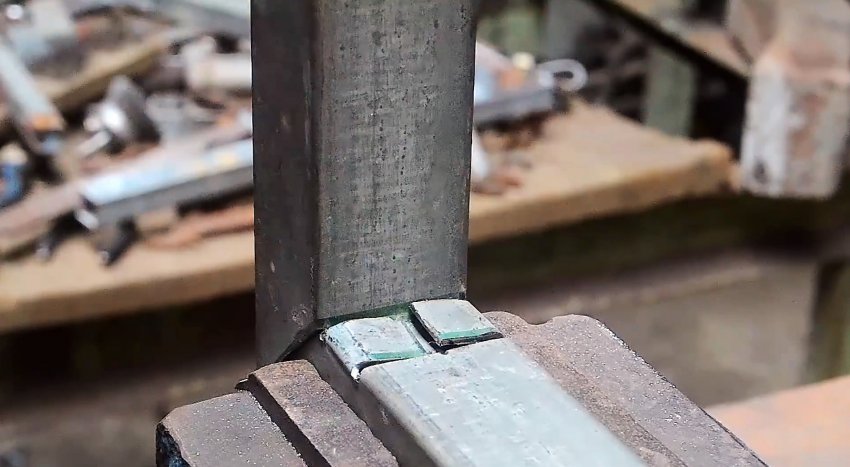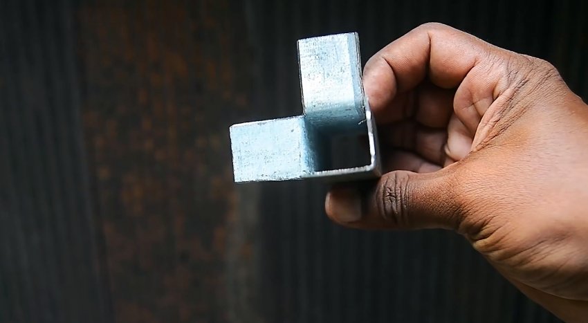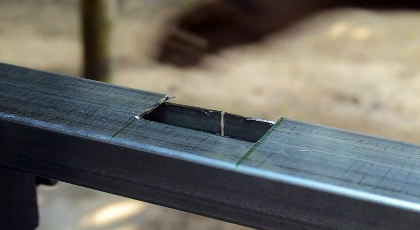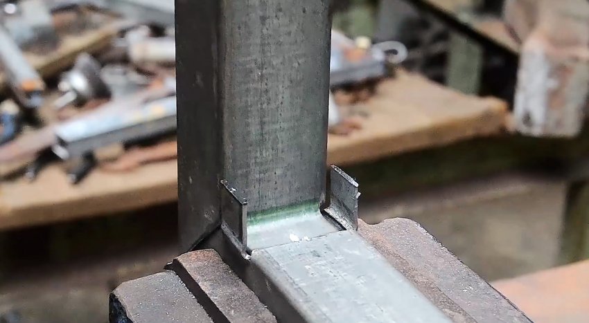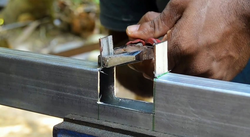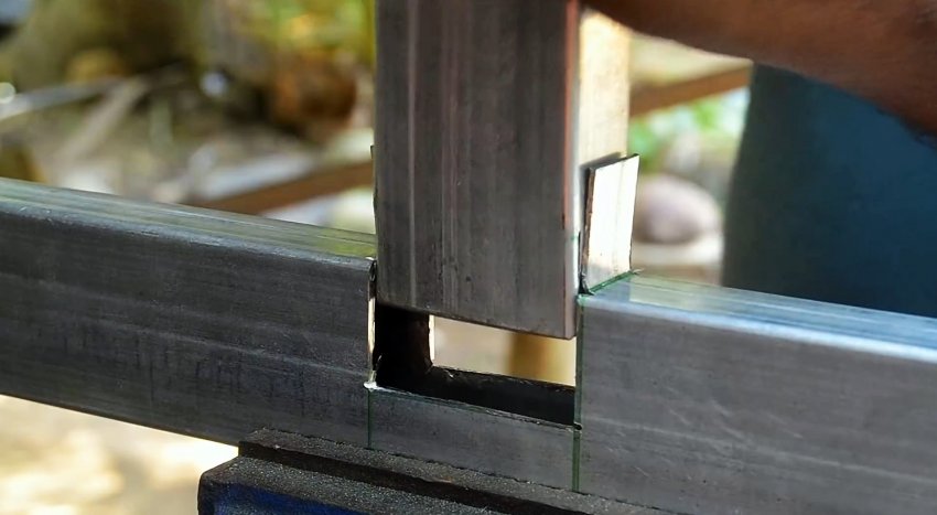 У второй трубы с торца делается 3 продольные надреза по граням. Их длина должна соответствовать ширине трубы. Полученные в итоге 2 язычка выгибаются наружу под прямым углом.